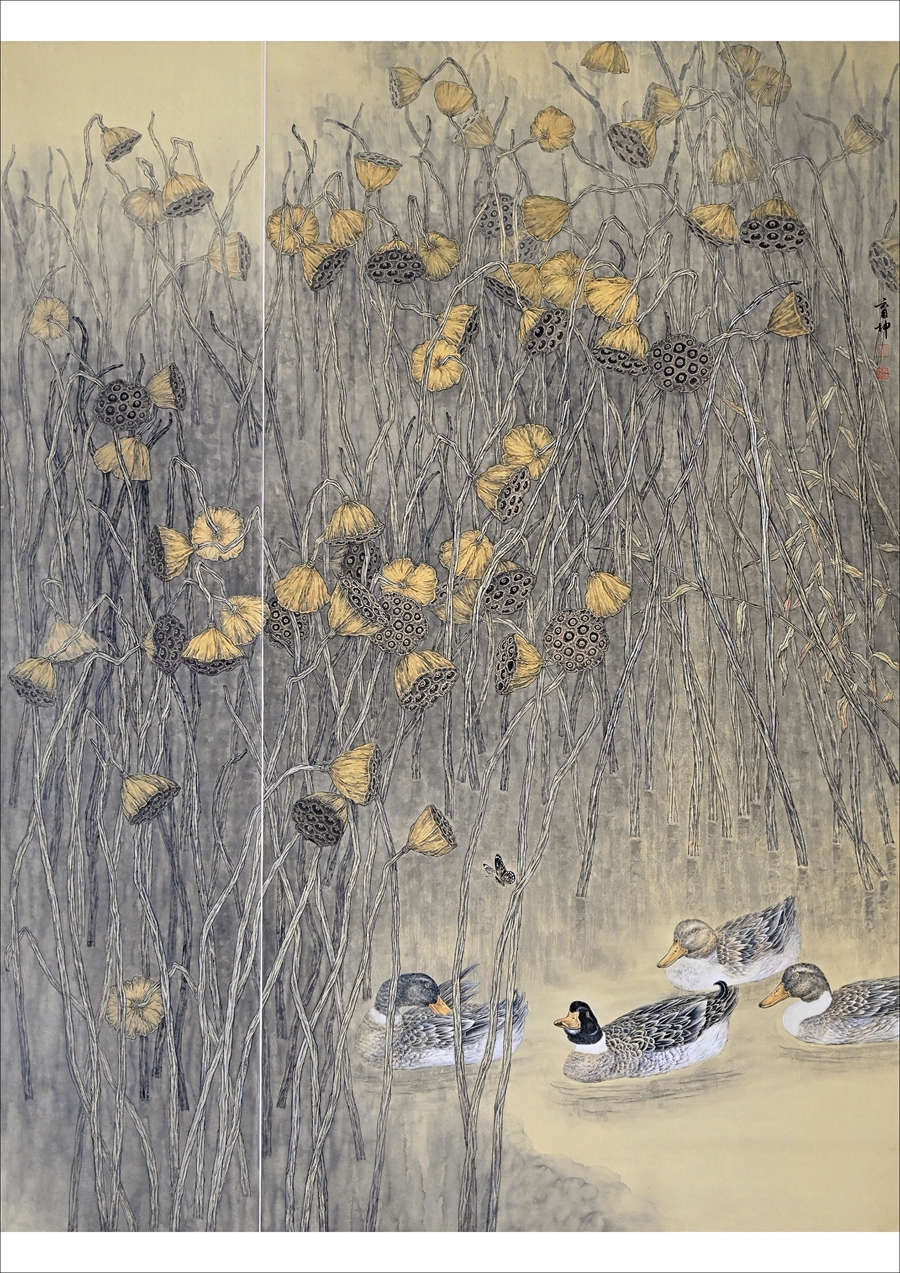觀察要夠入微,創作時更要細致,林育坤創作一幅畫作往往需要數月。分染、勾染、統染、撞水、撞墨、撞色……工筆國畫注重三礬九染,為了達到厚重、細膩、潤麗之美,林育坤將“百般武藝”各種技法全用上,不達效果誓不罷休。“我還曾有過春節假期七天不見客的經歷,胡子都長了一大截,大有‘朋友相見不相識’之感。”