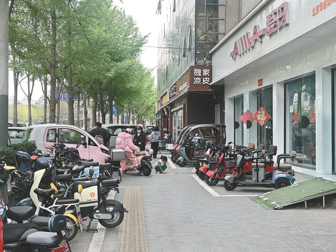 在多位家長的指引下,記者來到了附近的新華南路,路西側有多家電動車行。待出售的電動三輪車占滿了店門前的便道,令人眼花繚亂,不少準備購車的顧客正在聽商家“解讀”購車和駕駛方面的法律法規。