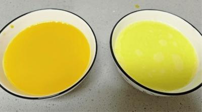 10分鐘后,雞蛋液已成型為雞蛋羹,但后者為黏糊疙瘩狀。經觀察,雞蛋液做的雞蛋羹呈橙色,而雞蛋做的為淡黃色,兩者顏色相差較大;前者表皮更加光滑,無蜂窩眼,外觀形似布丁,口感更滑更嫩,口味更鮮;后者表皮略粗糙,有較多小孔。