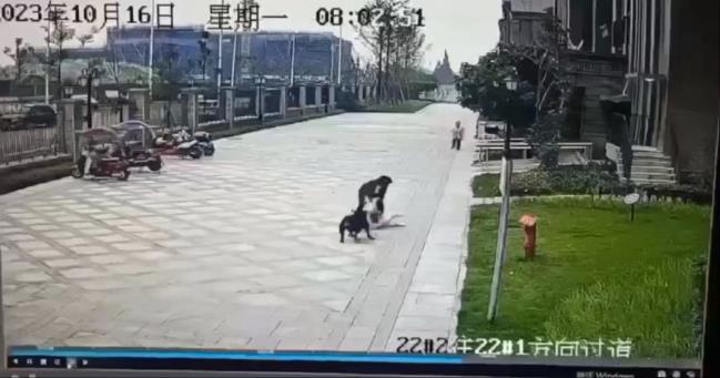 網絡上一段時長2分7秒的監控視頻顯示,16日8時許,在成都崇州市恒大西辰綠洲小區一棟建筑物底下,一只黑色犬只不停地徘徊、逗留,走動約1分鐘。8時2分35秒,母親鄧某牽著唐某走出大樓,黑色犬立刻圍了上來,并對唐某展開撕咬,并將其拖至草坪,約40多秒。