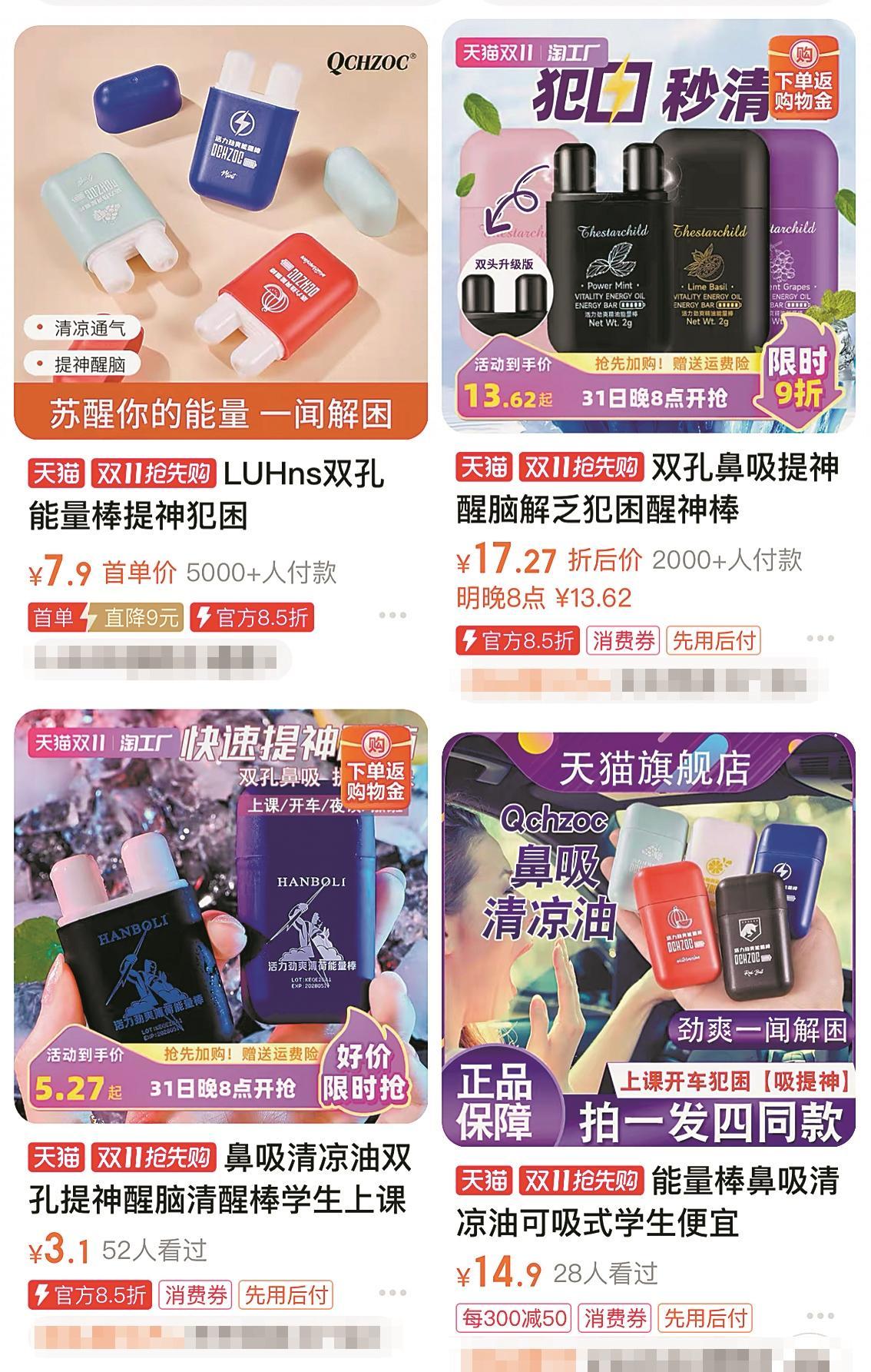 記者在電商平臺搜索發(fā)現(xiàn),不少線上商家在售賣這種“鼻吸能量棒”,價格多在幾元至幾十元之間,部分產(chǎn)品月銷量達(dá)上千件。從商家宣傳看,產(chǎn)品主要由薄荷腦、冰片、植物精油等成分構(gòu)成,氣味多樣,有些產(chǎn)品還加入了烈酒成分,以吸引消費者購買。