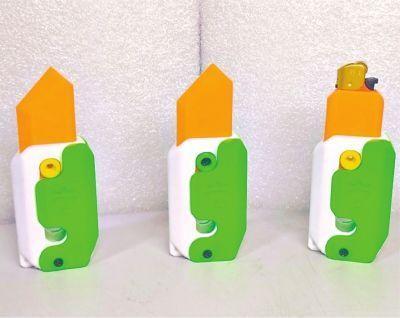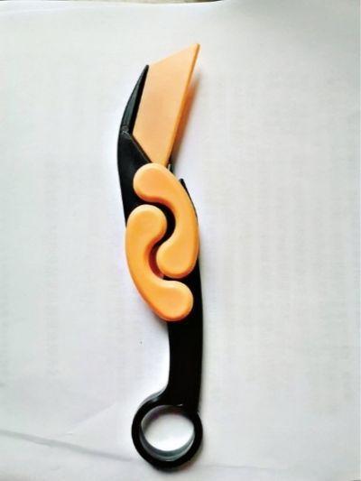 市面上銷售的蘿卜刀是一款由塑料制成的仿刀具玩具,外形酷似胡蘿卜。玩者用手一甩,“唰”的一聲刀片彈出,并能借助自身重力滑回卡槽,也被稱為“重力胡蘿卜刀”。