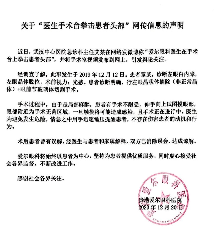 對此,貴港愛爾眼科21日凌晨在微信公眾號發聲明回應稱:經調查了解,此事發生于2019年12月12日。患者覃某,診斷左眼白內障,左眼晶體脫位,在行左眼晶狀體摘除(非正常晶體)+眼前節玻璃體切割手術過程中,由于是局部麻醉,患者有手術不耐受,伸手向上試圖摸眼部,眼部附近為手術無菌區域,一旦觸摸將可能造成感染,且手術正在進行中,醫生為避免發生危險,情急之中用手迅速錘壓提醒患者,不存在傷害患者的動機和行為。