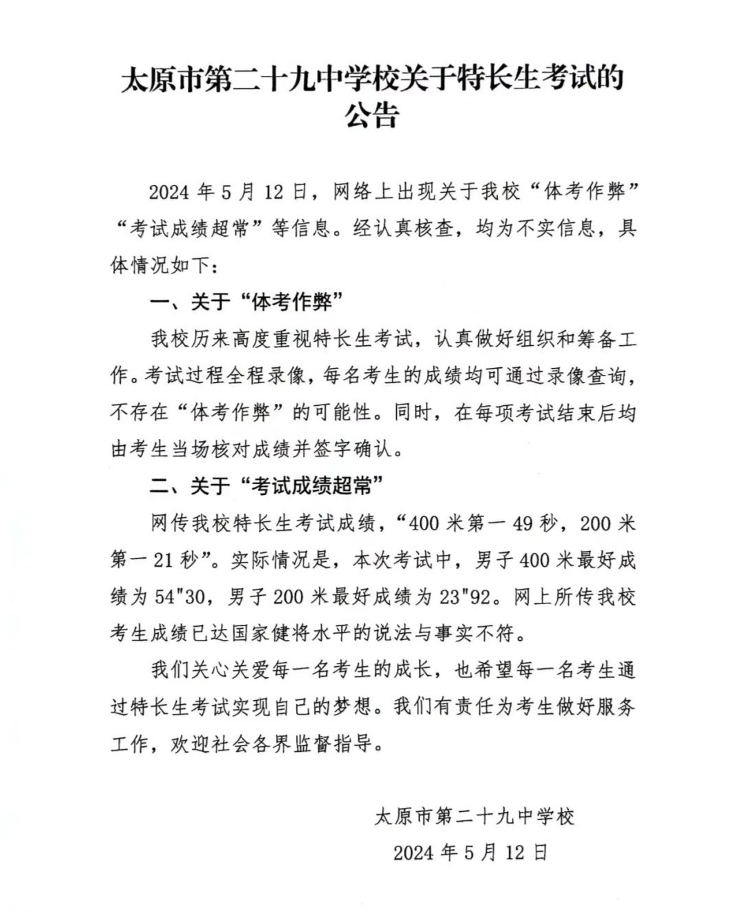 5月12日,網絡上出現關于山西省太原市第二十九中學校“體考作弊”“考試成績超常”等信息,引發社會廣泛關注。當天深夜,太原市第二十九中學校就該事件發布公告稱,經認真核查,上述信息均為不實信息。