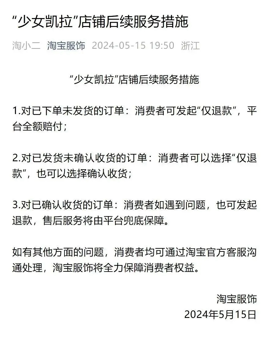 5月15日晚,淘寶服飾官方賬號發布《“少女凱拉”店鋪后續服務措施》,文中提到“對已下單未發貨的訂單:消費者可發起“僅退款”,平臺全額賠付;對已發貨未確認收貨的訂單:消費者可以選擇“僅退款”,也可以選擇確認收貨;對已確認收貨的訂單:消費者如遇到問題,也可發起退款,售后服務將由平臺兜底保障。如有其他方面的問題,消費者均可通過淘寶官方客服溝通處理,淘寶服飾將全力保障消費者權益。”