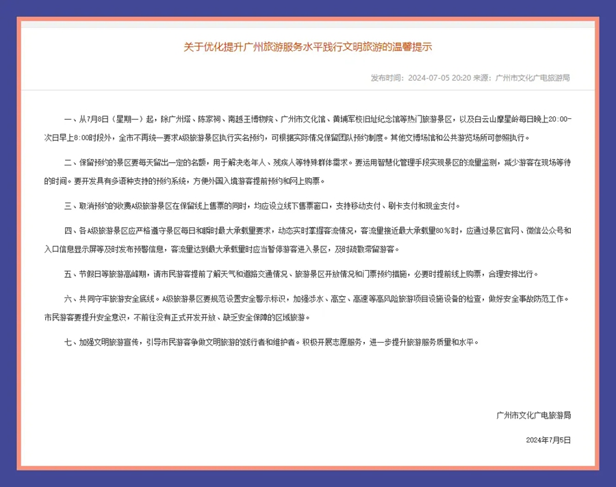 7月5日晚,廣州市文化廣電旅游局官網發布《關于優化提升廣州旅游服務水平踐行文明旅游的溫馨提示》(以下簡稱《提示》)擬對廣州市旅游景區、文博場所游客預約工作進行優化調整。