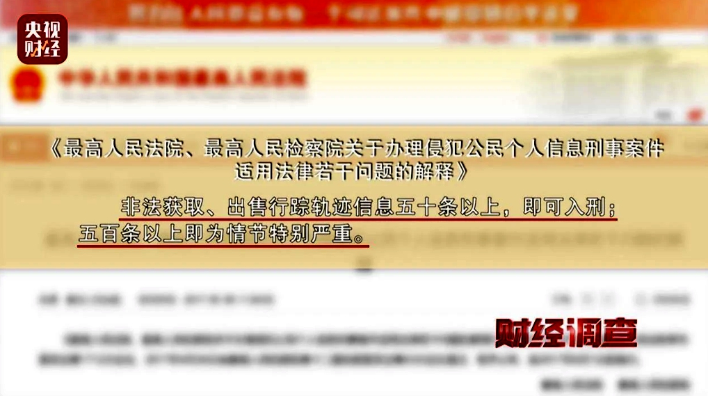 2017年《最高人民法院、最高人民檢察院關于辦理侵犯公民個人信息刑事案件適用法律若干問題的解釋》中規定:非法獲取、出售行蹤軌跡信息五十條以上,即可入刑;五百條以上即為情節特別嚴重。