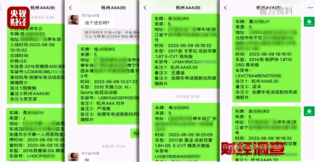 犯罪分子的聊天群里每天在滾動發布著各種車輛的實時停車信息,包括了車牌號、停車場具體地址、進場時間等等。