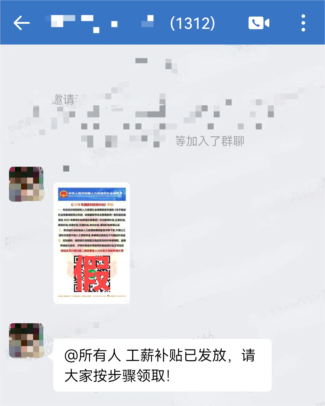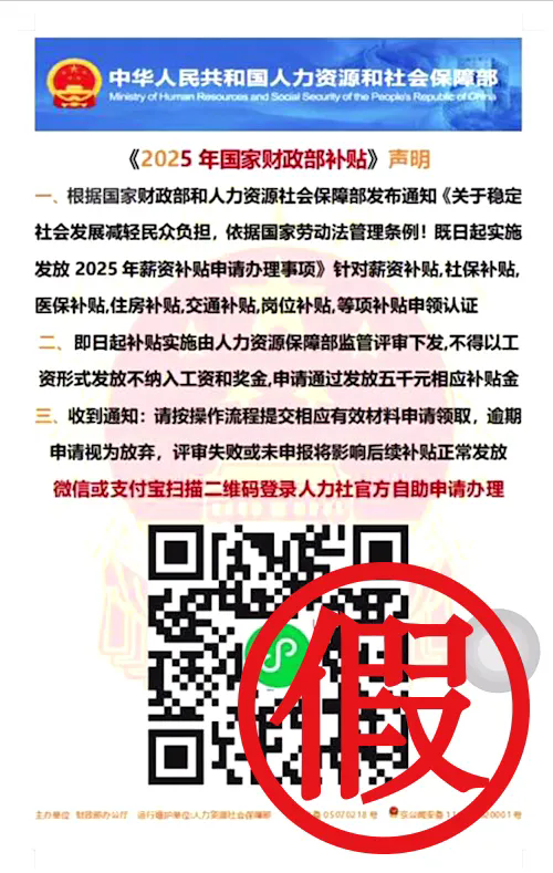 近日,小雪的企業微信賬號被騙子盜用,同事大強被“小雪”拉入名為“工薪補貼”的企業微信群聊,隨后“小雪”在群內發布了一張圖片,圖片上有“中華人民共和國人力資源和社會保障部”“《2025年國家財政部補貼》聲明“微信或支付寶掃描二維碼登錄人力社官方自助申請辦理”等字樣