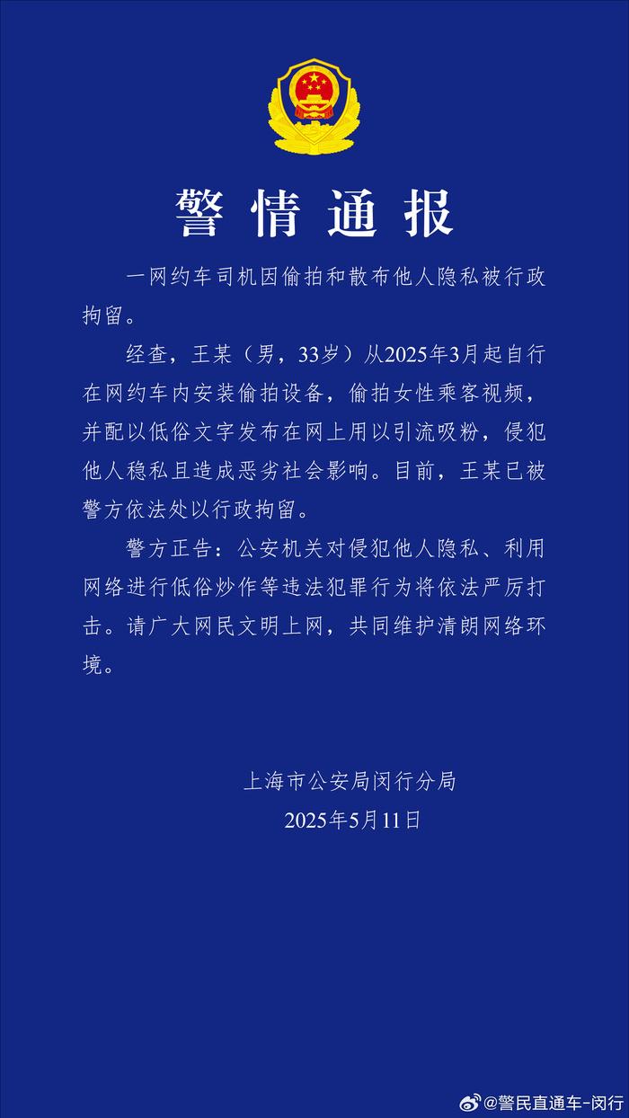 據(jù)@警民直通車-閔行 微博消息,5月11日,上海市公安局閔行分局發(fā)布警情通報(bào):一網(wǎng)約車司機(jī)因偷拍和散布他人隱私被行政拘留。