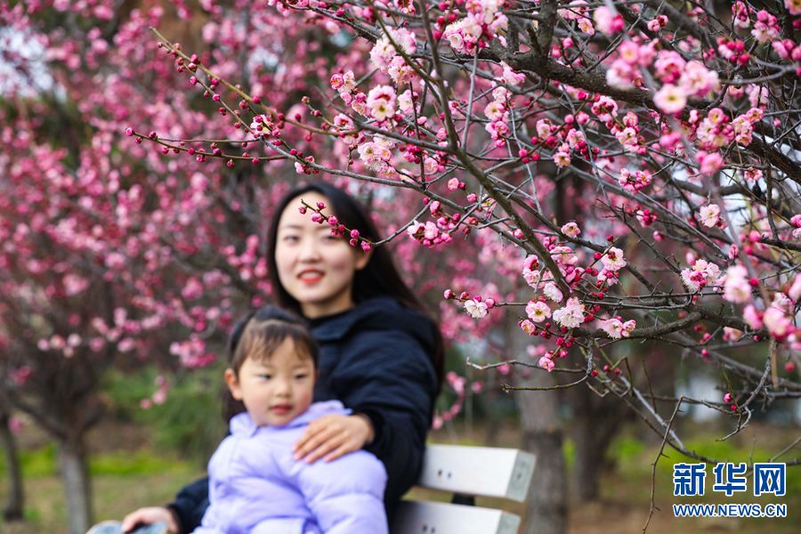 2月25日,游客在河南省信陽市光山縣官渡河風景區光州公園賞花游玩。