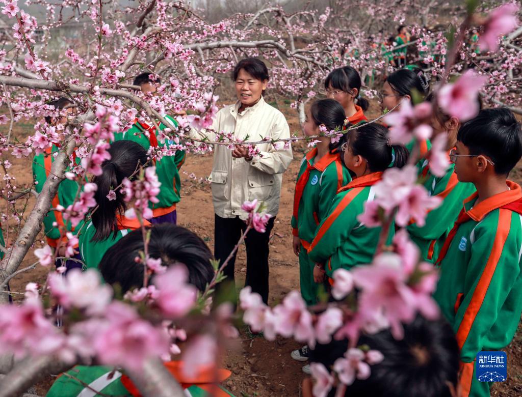 4月10日,技術人員在桃樹果園向河北省遵化市東舊寨鎮梁屯中心小學的學生介紹桃樹生長知識。