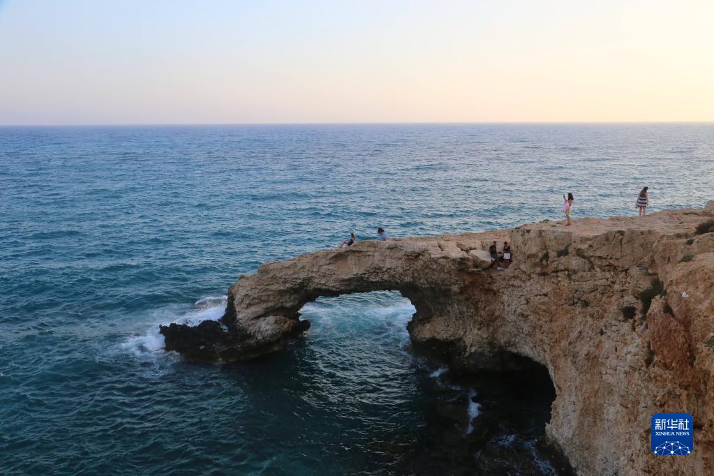 在塞浦路斯圣納帕東部海蝕洞景區(qū),一處海岸邊海水侵蝕后形成的天然石橋“愛之橋”因美麗的景色成為游客打卡地。