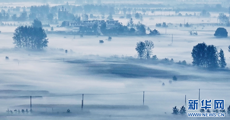 ?初秋時節,安徽省阜陽市蒙洼蓄洪區晨霧繚繞,村莊、田野、道路在輕紗薄霧氤氳下,若隱若現,如夢似幻。新華網發(周輝 攝)