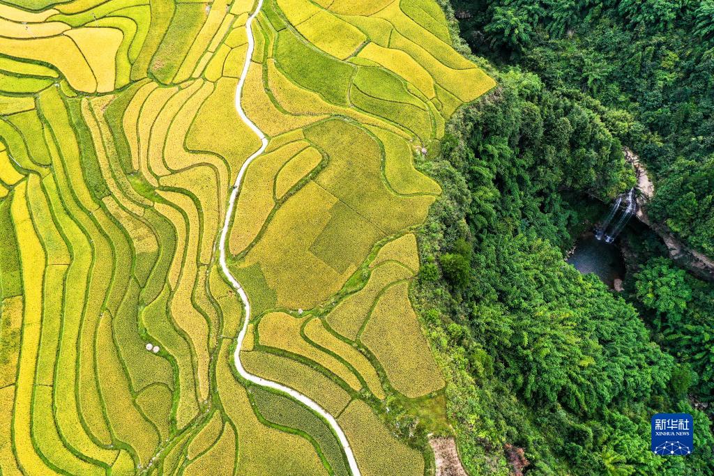 白露將至,貴州省黔南布依族苗族自治州貴定縣沿山鎮臘利梯田里的水稻逐漸成熟,呈現出一幅豐收在望的秋日畫卷。