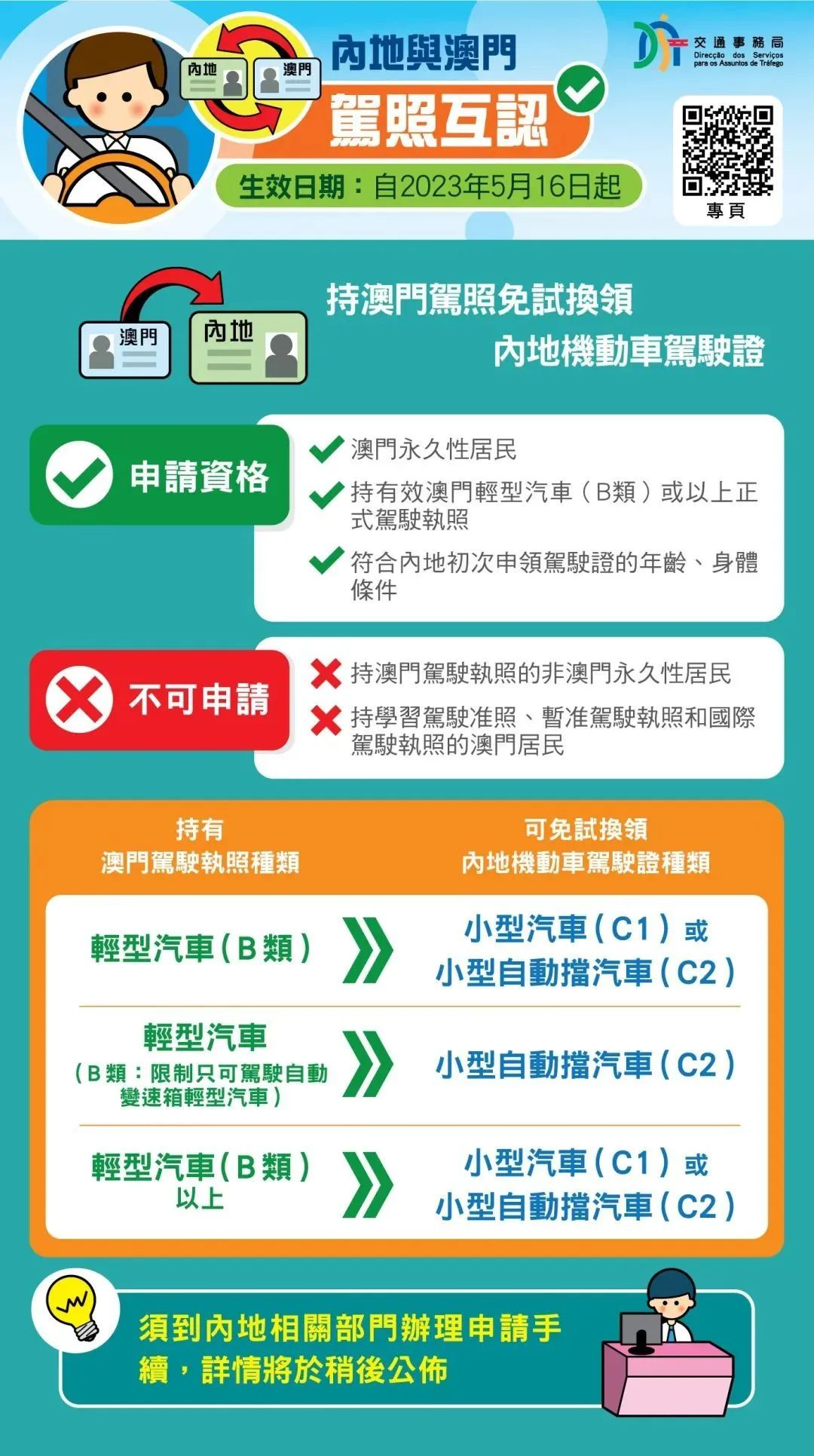 今年2月,公安部與澳門特別行政區政府簽署《內地與澳門關于互認換領機動車駕駛證的協議》,實現內地與澳門駕駛證免試互認換領。該協議于今日正式生效!
