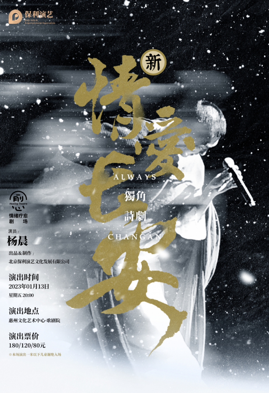 《情愛長安》是一部由一個人的聲音完成的獨角詩劇。表演者楊晨僅憑一個人的聲音,用如詩的語言講述長安城——中國歷史上最輝煌的都城里最著名人物的愛情故事。