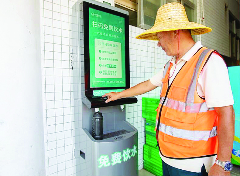 因為安裝時間不長,來取水的市民不是很多,但已經有“好奇寶寶”來研究飲水機的用法。“這個機器太方便了,掃個碼輕輕一按,水就出來了!”在現場,因運動而滿頭大汗的市民徐先生說。他對場館內設置直飲水點這一做法非常滿意。“以前要自己帶杯子喝水,夏天出汗多,口渴得厲害,常常一杯不夠喝,現在好了。”