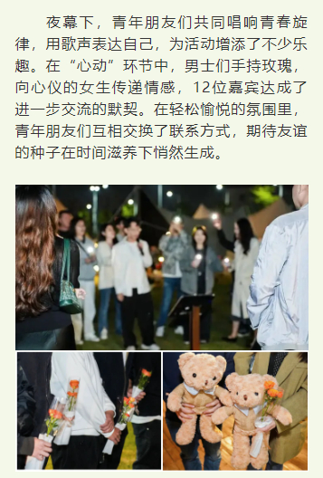 夜幕下,青年朋友們共同唱響青春旋律,用歌聲表達(dá)自己,為活動增添了不少樂趣。在“心動”環(huán)節(jié)中,男士們手持玫瑰,向心儀的女生傳遞情感,12位嘉賓達(dá)成了進(jìn)一步交流的默契。在輕松愉悅的氛圍里,青年朋友們互相交換了聯(lián)系方式,期待友誼的種子在時間滋養(yǎng)下悄然生成。