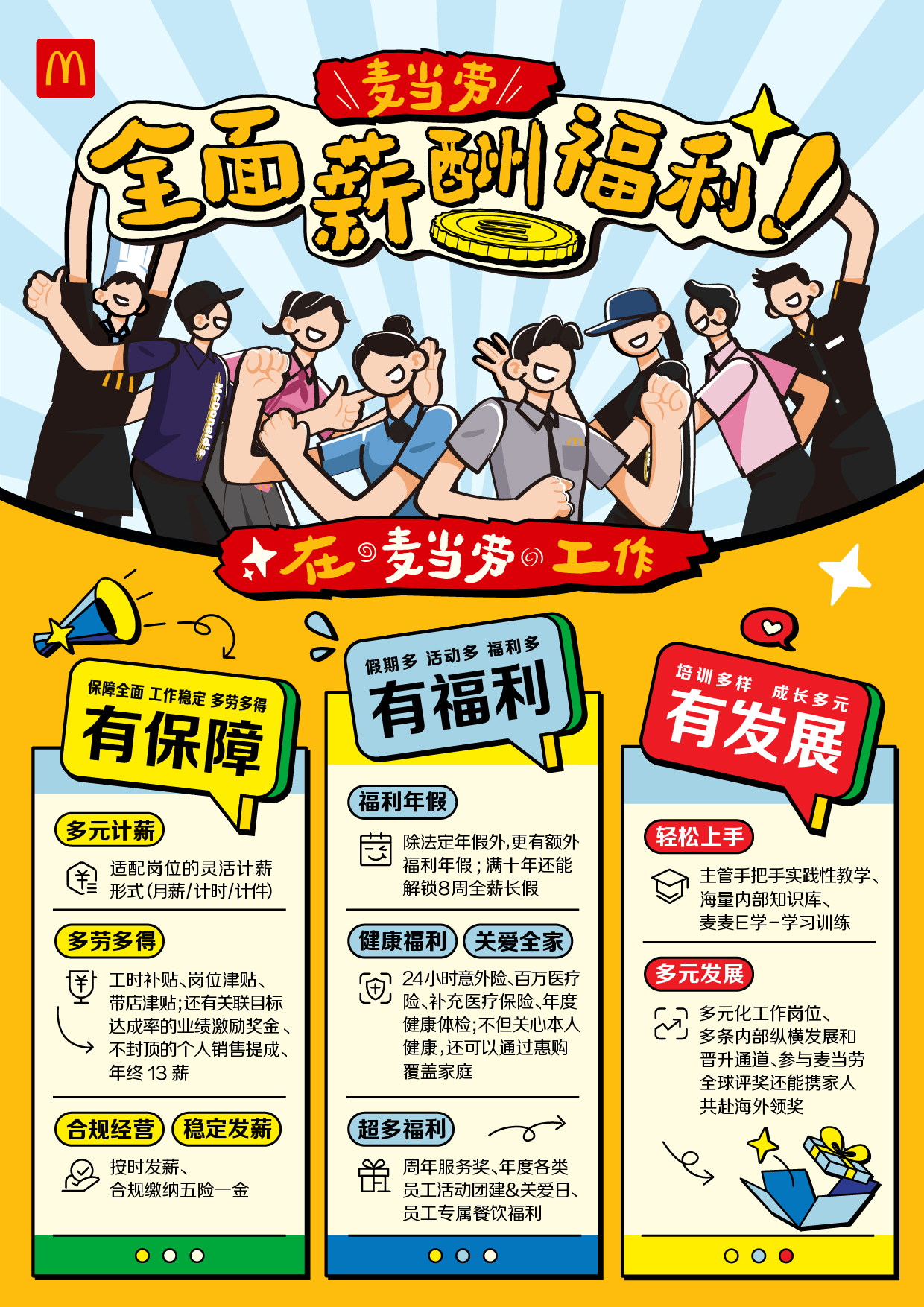 ”人員是麥當(dāng)勞最寶貴的財(cái)富,我們希望每位員工在這里有保障、有福利、有發(fā)展,能在工作中有安全感,在成長(zhǎng)中找到幸福感和獲得感,“麥當(dāng)勞中國(guó)首席人員官王艷偉表示,”麥當(dāng)勞全面薪酬福利體系為員工提供全方位支持,不僅對(duì)員工的辛勤付出及時(shí)認(rèn)可和感謝,更為他們的未來成長(zhǎng)持續(xù)規(guī)劃和投資,以培養(yǎng)人才全面發(fā)展,促進(jìn)高質(zhì)量充分就業(yè)。“
