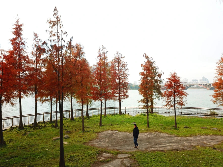 近日,市區(qū)東江沙公園一片紅杉林漸成佳境,臨江的一側(cè)居然藏著10多株艷麗的紅杉樹(shù)。遠(yuǎn)遠(yuǎn)地就看見(jiàn)江邊一抹亮紅,一棵棵紅杉樹(shù)特別顯眼,淺紅、深紅、金紅等多種顏色交織在一起,倒映在東江的湖面,成為一道獨(dú)特的風(fēng)景線(xiàn),恍如進(jìn)入油畫(huà)世界,吸引了眾多市民來(lái)打卡拍照。