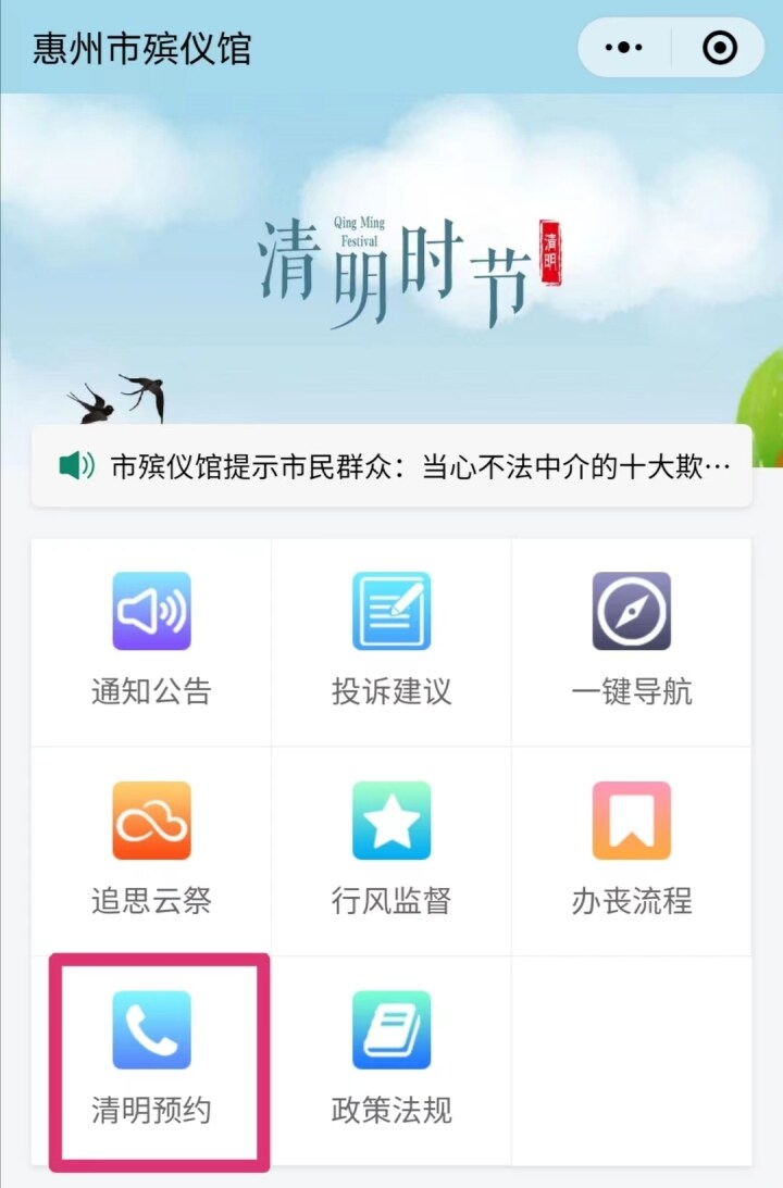 記者看到,目前“惠州市殯儀館”微信公眾號已開通“清明預約”欄目,并顯示該預約通道將于2023年3月23日開放。市民也可以通過“惠州民政”微信公眾號,點擊“便民服務-祭掃預約”進行預約。