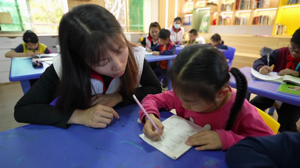 下午5時許,放學的孩子們紛紛走進村頭村兒童服務站,自覺地拿出書本,安靜地做起了作業(yè)。遇到不懂的問題,他們舉起小手,一旁的志愿者老師就上前為他們輔導。