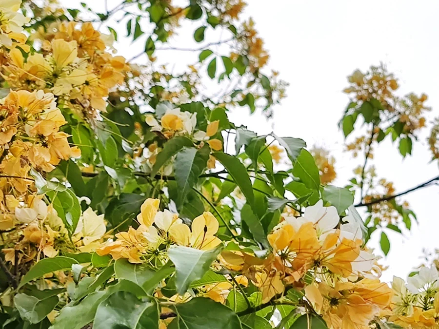 清明時節,人們紛紛來到陳公堤踏青賞花。漫步堤岸,層層疊疊的魚木花壓滿枝頭,遠遠望去,宛如云蒸霞蔚,為過往的市民游客送去幸福、吉祥、如意。清風拂過,攜來陣陣淡雅清香,花瓣緩緩飄落,優雅浪漫。細賞魚木花,雪白和金黃的花瓣輕盈舒展似蝴蝶展翅,紫紅色的細長花蕊像蝴蝶觸角,整一個仙氣飄飄。