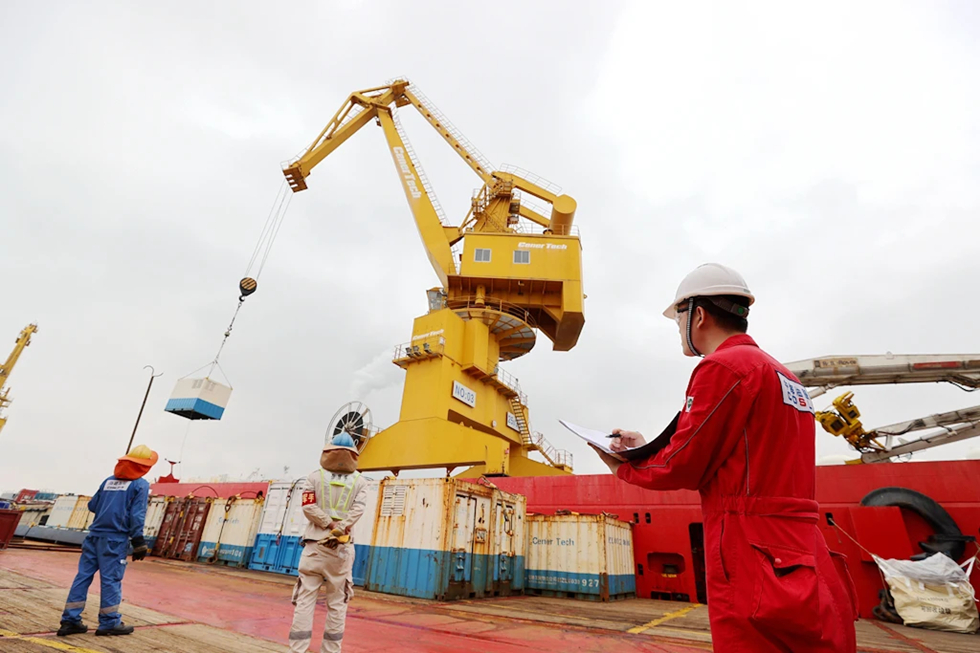 4月23日晚9時(shí)20分許,“海洋石油681”船舶裝載好滿(mǎn)滿(mǎn)一船物資后,從中海石油惠州物流基地離港出發(fā),向中國(guó)南;葜萦吞镞M(jìn)發(fā)。