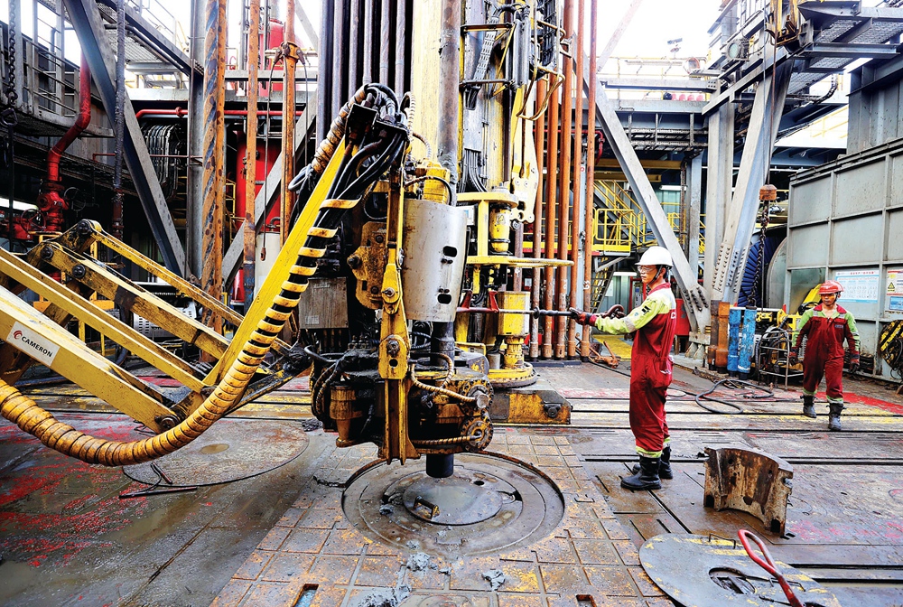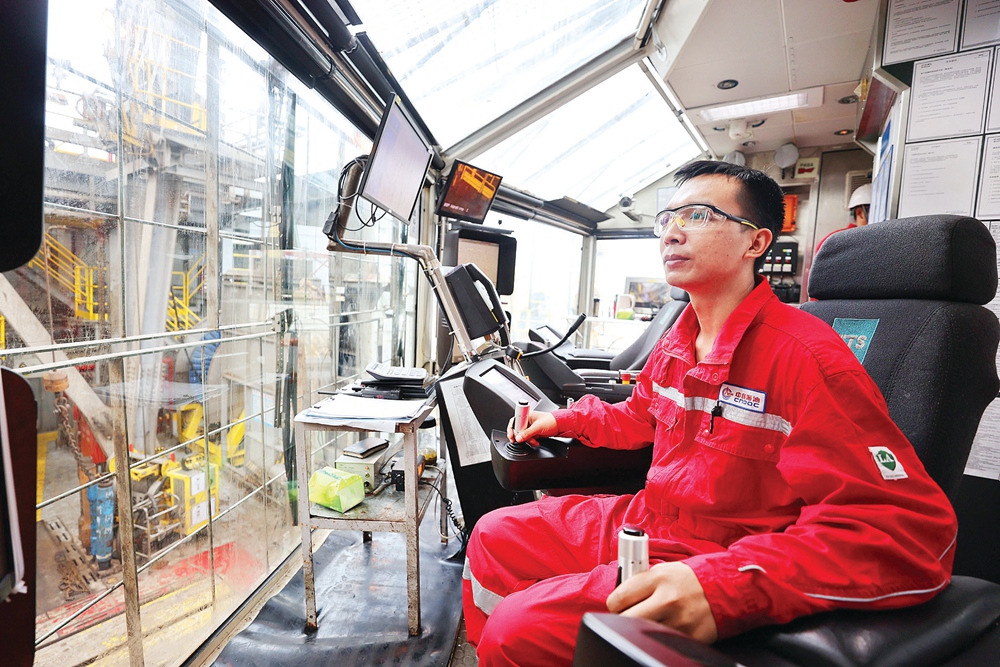 司鉆房堪比“國瑞”平臺的“心臟”,這也是“國瑞”平臺最核心的區域。圖為司鉆正在全神貫注操作鉆井設備。