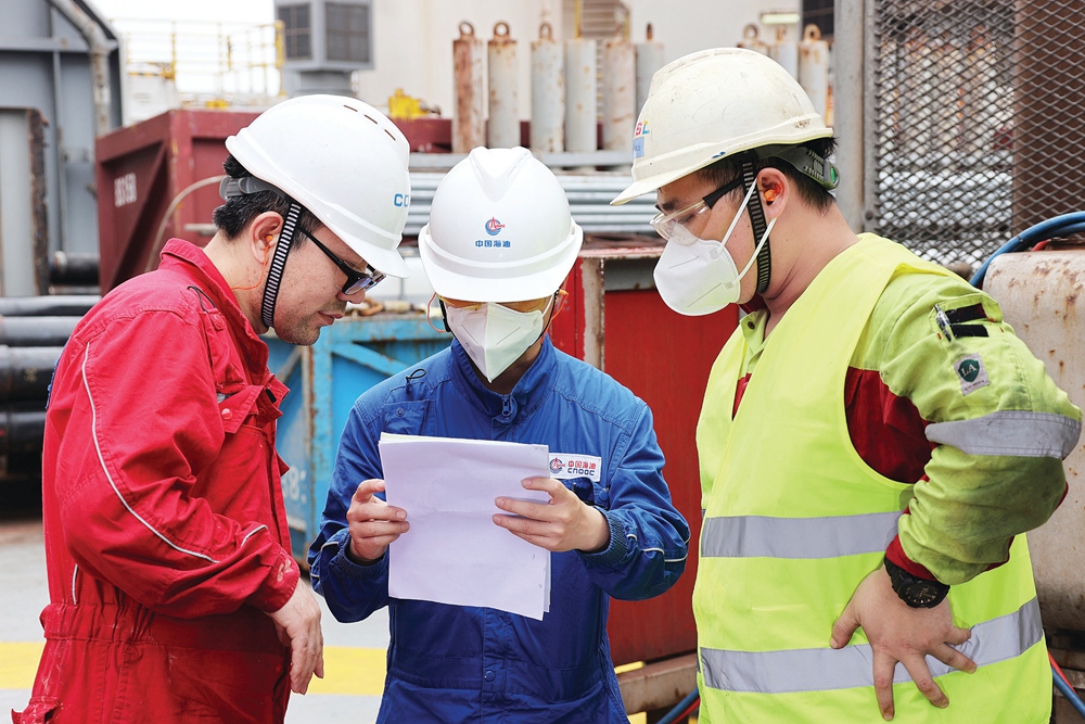“國瑞”平臺甲板上,幾名不同崗位的海洋石油工人在進行工作安全分析。