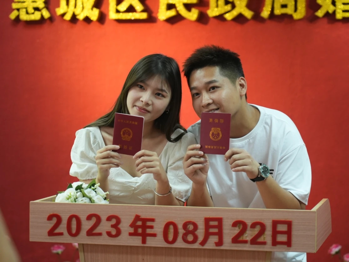 呂先生和劉小姐領到結婚證,曬出“小紅本”,開心地在鏡頭前做出心型的手勢。“我特意選了七夕這個美好的日子和女友前來領證。”新人呂先生和大家一起分享“甜蜜”。他和女友是研一時開始談戀愛的,研究生畢業后一起通過人才引進的方式來到惠州工作安家,“我們都是北方人,在這里相互依靠建起小家。”劉小姐滿眼幸福地告訴記者,她和呂先生經過六七年的戀愛,共同經歷了人生中的求學奮斗時光,最讓她感動的是疫情期間的一次經歷,“他當時身體很不舒服,我發熱了,他還半夜里背著我去醫院,他是一個很有責任感的人。”