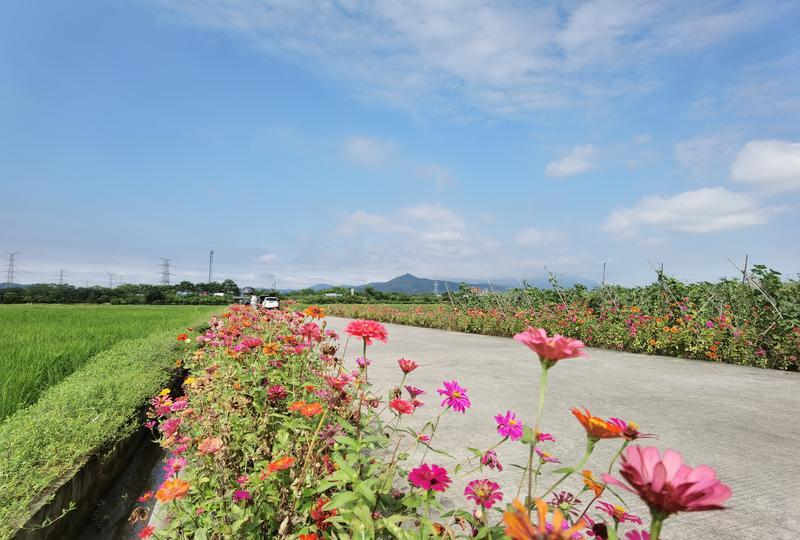 在機耕路兩旁,各色花兒綻放,迎風搖曳,不時還有蜜蜂和蝴蝶在花兒周圍追逐,為這幅美麗的自然畫卷增添了絲絲靈氣。