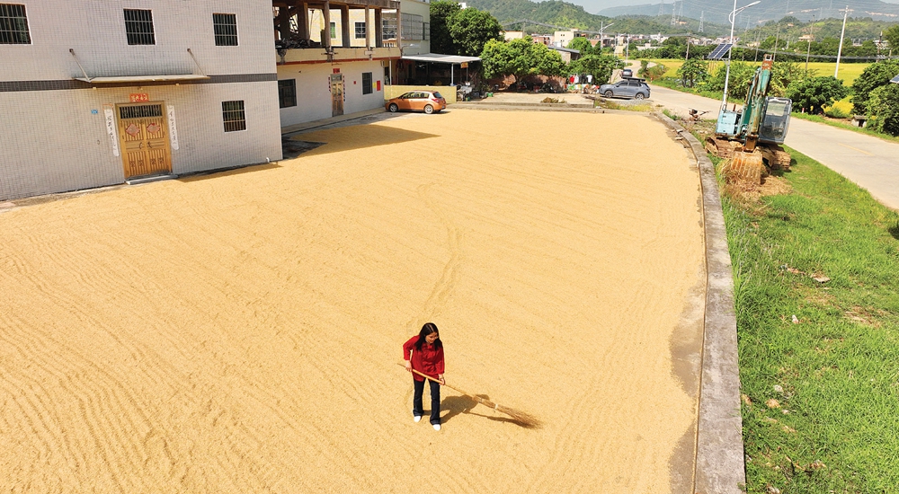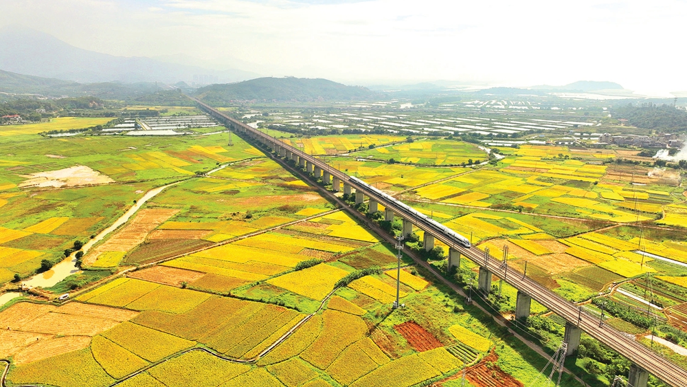 博羅縣園洲鎮九優糧油種植基地內,收割機在金黃的稻田上來回作業,收割、脫粒、碎稈還田等工序一氣呵成。惠東縣稔山鎮老坑村、竹園村等鄉村里,村民將農機收割的稻谷裝袋,笑容滿面,滿載而歸。這頭,農民在自家小院里曬稻谷,金黃的稻谷鋪滿院落;那頭,村民借助機器收取晾曬好的稻谷,省時省工;遠處,高鐵列車在金黃的稻田間疾馳而過,伴著農機運作的轟鳴聲,奏響鄉村振興協奏曲。