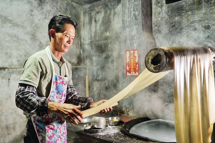 “我家鄉的薯粉絲都是手工制作,口感柔滑筋道。我的祖輩父輩都是靠制作粉絲養家糊口的,到了我們這一代,就想把小粉絲做成大產業,帶動村里更多人致富。”元嶺村村民吳海岸介紹,他們一般選用檳榔薯作為制作薯粉絲的原材料。每年6~7月種下種苗,11月收成后,村民們會把番薯碾磨成粉并調成薯漿,過濾后倒入大水池經過兩次沉淀,將淀粉提純后拌漿、再沉淀。吳海岸介紹,拌漿是個技術活,淀粉與水的比例必須分毫不差,水少蒸出的粉皮過硬,水多則稀,蒸不出粉皮。