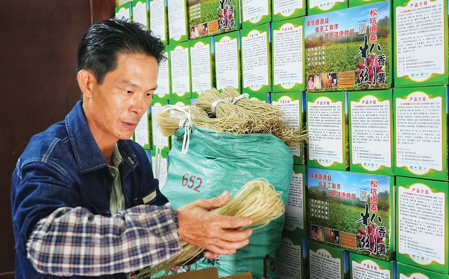 在惠東縣多祝鎮元嶺村、河北村等十幾個自然村,有60多戶村民一直保留著手工制作薯粉絲的傳統,通過電商平臺拓展銷售渠道,讓薯粉絲“走出”惠東小山村,走向更廣闊市場,成為村民增收致富的“金粉絲”。