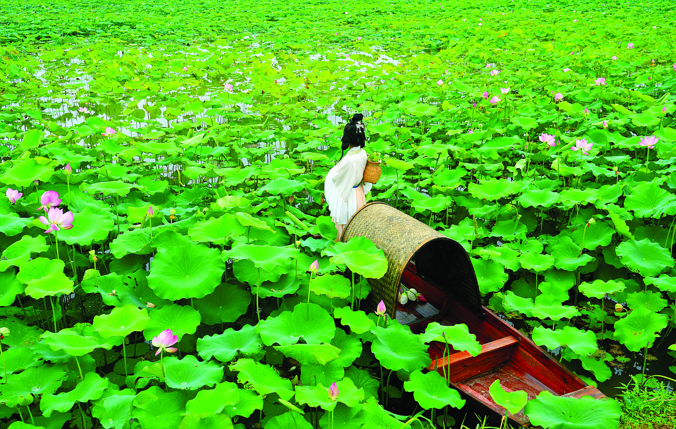 三棟鎮(zhèn)紫溪半島荷花池內(nèi),游客乘船穿梭其間。