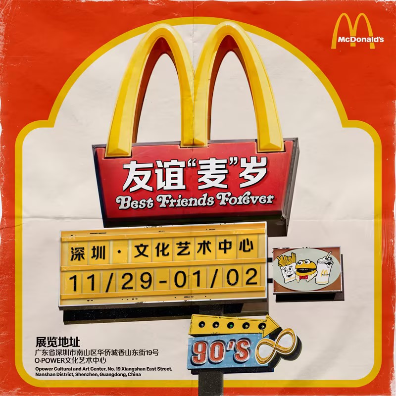 為了與更多粉絲回顧、分享這段美味與友誼同行的旅程,11月25日起,麥當勞中國將在北京、上海、廣州/佛山以及深圳陸續舉辦“BFF友誼麥歲”潮流文化藝術展。本次展覽,麥當勞將通過“BFF”的視角,以麥當勞中國33年為線索,為觀眾搭建一個“時空隧道”:從“1990年代:回味·初識”、“2000年代:趣味·歡聚”、“2010年代:尋味·成長”到“2020年代:玩味·潮流”,帶領觀眾走入不同時空下與品牌共歷的友誼歲月。
