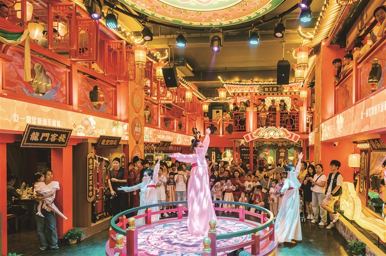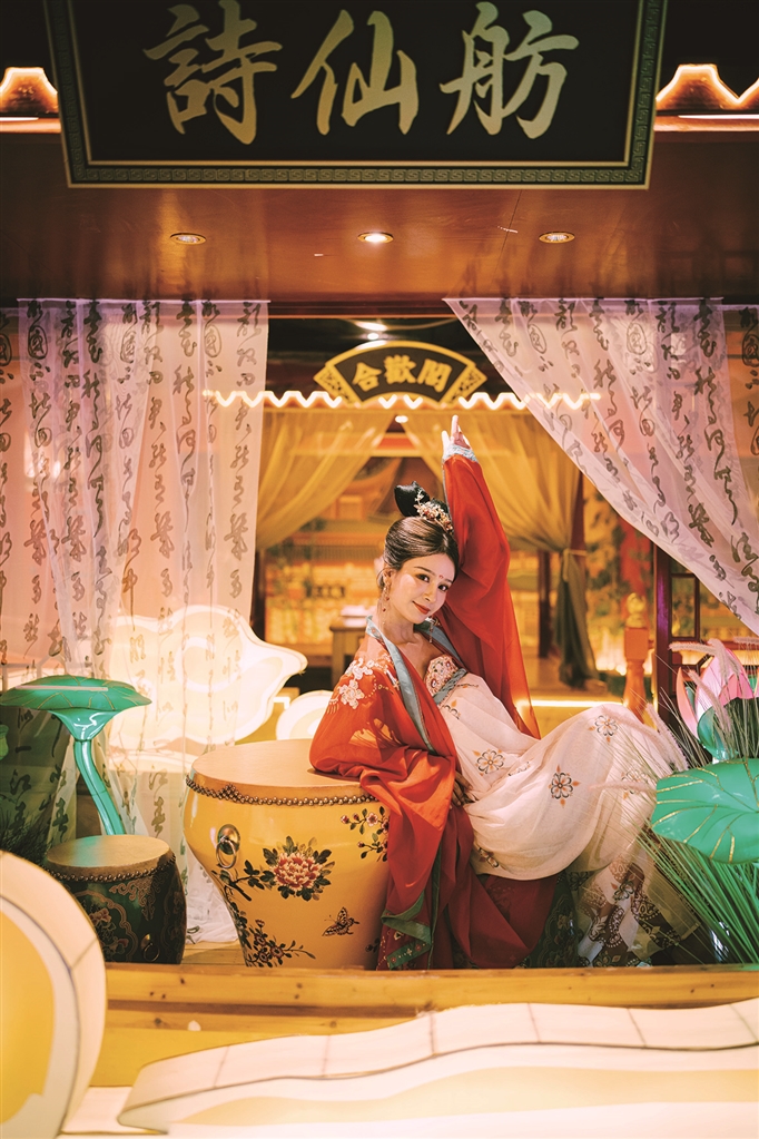 身著唐朝服飾穿梭于店內的士兵、侍女,挑著扁擔的小販,華麗的唐朝歌舞……一場“唐宮夜宴”生動浮現。因為場景的延伸,各種飲食滋味也有了百般變化,讓游客擁有更加豐富、深刻的用餐感受。