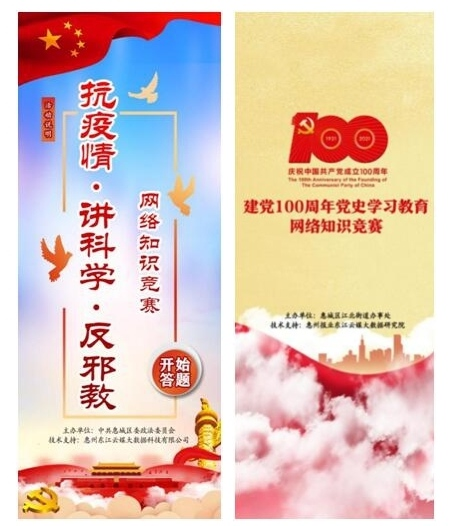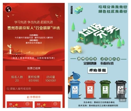 惠州東江數字文化科技有限公司自創辦以來,多次與惠州市各企事業單位合作開展網絡知識競賽和網絡投票等活動,開發了一批線上網絡互動應用。其中包含“惠州核酸檢測地圖”便民服務平臺、“抗疫情·講科學·反邪教”網絡知識競賽、“最美隆生”攝影投票大賽、“六治協同·平安博羅”攝影大賽、“惠州市退伍軍人行業明星”投票活動、“建黨100周年黨史學習教育”網絡知識競賽、“垃圾分類我先行 綠色分類我最行”垃圾分類競賽等。
